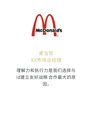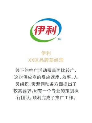 i-d先后經(jīng)歷與Audi、Mercedes-Benz、infiniti、PORSCHE、可口可樂、麥當(dāng)勞、肯德基、Budweiser、華為、小米、中國(guó)移動(dòng)、ELLE、L'OREAL、萬達(dá)、仁恒置地、恒大、碧桂園、蘭桂坊...的業(yè)務(wù)合作,成功地將國(guó)際化的營(yíng)銷策劃理念及執(zhí)行方式融入本土,為更多的中國(guó)企業(yè)開啟全新的品牌推廣思路和執(zhí)行方案。